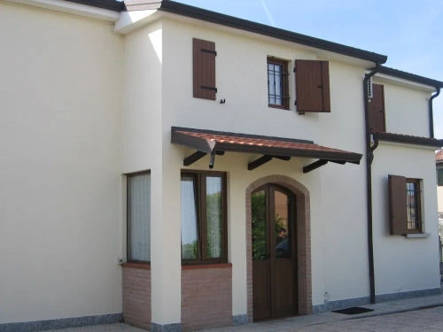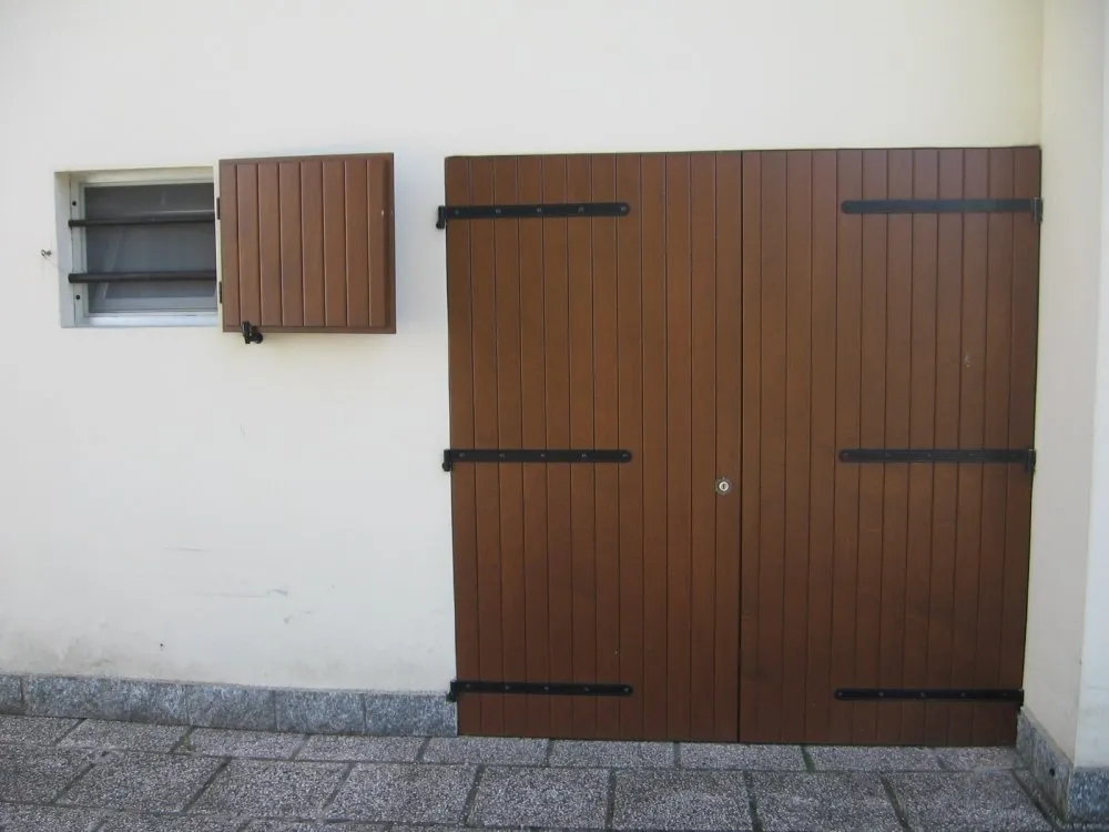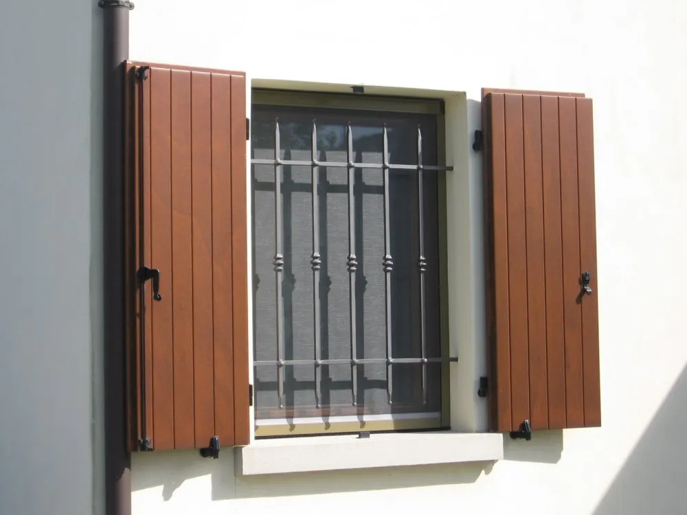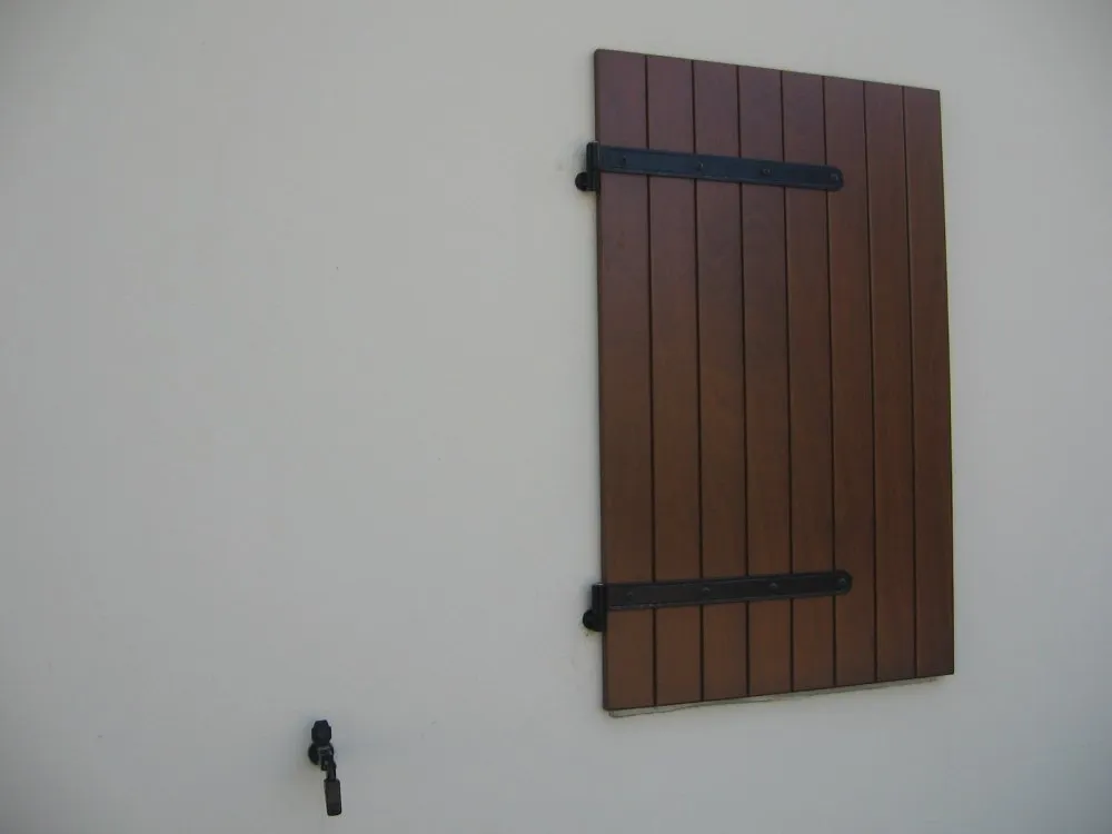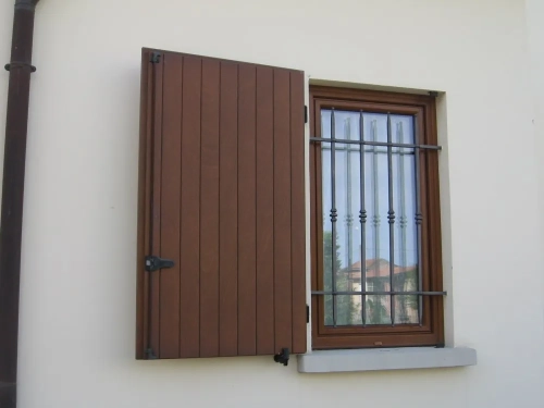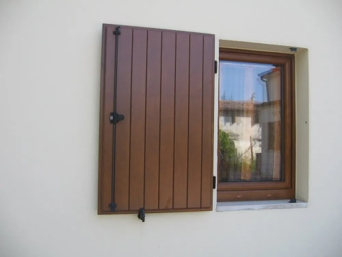Lo scuro in legno a doghe verticali in multistrato di Okoumé unisce solidità ed eleganza tradizionale. Le doghe verticali interne ed esterne conferiscono un aspetto classico e armonioso, mentre la chiusura a tre punti con spagnoletta e i cardini con fissaggio a fialetta chimica assicurano stabilità, durata e sicurezza.